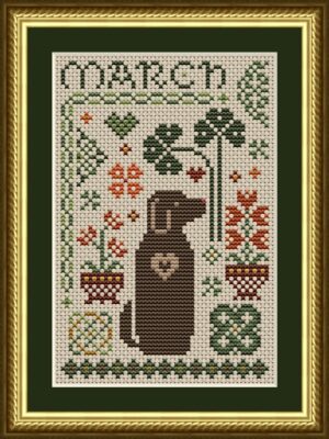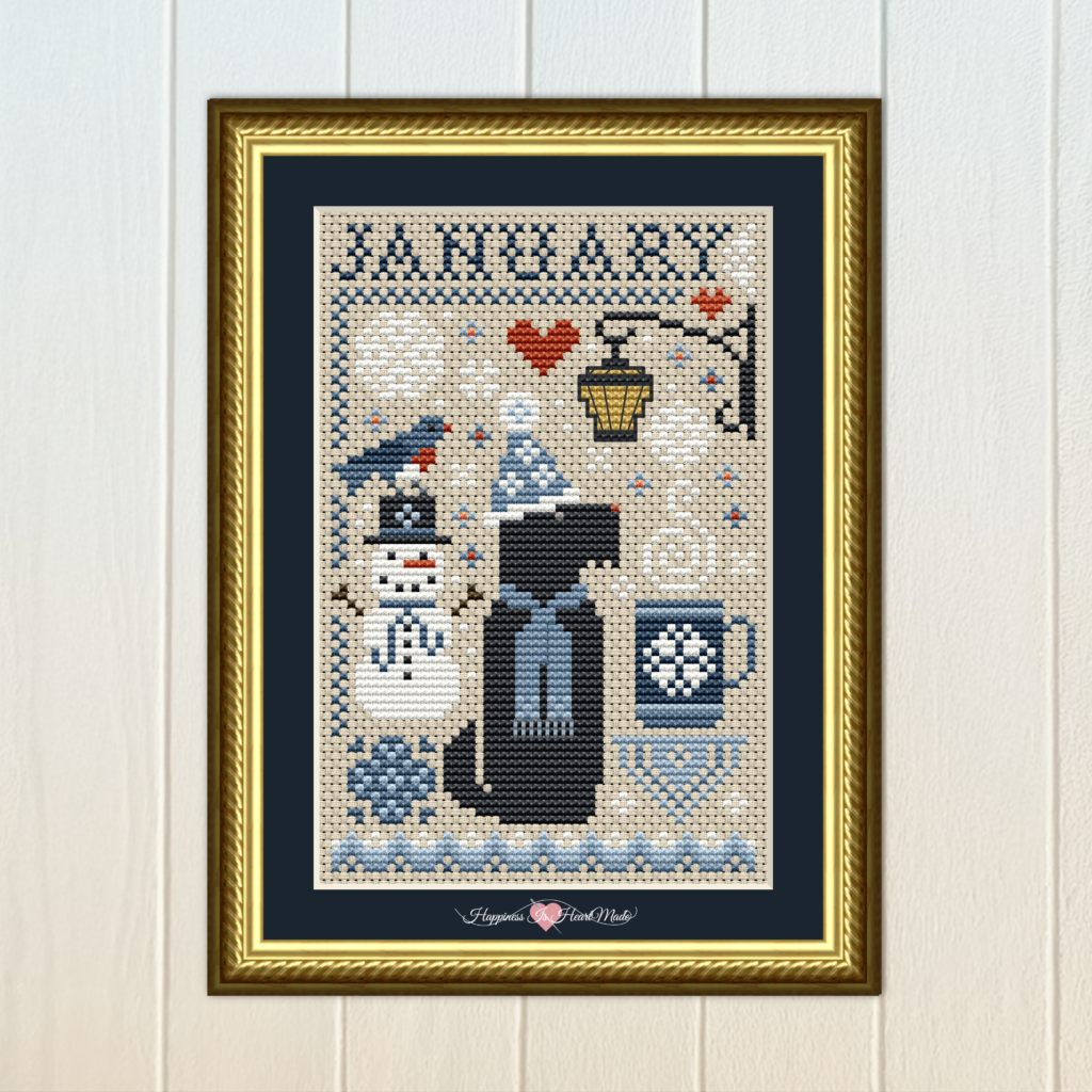 The Scottie January Dog cross stitch design is part of the Dog Days Series by Happiness Is HeartMade. This is a cozy winter design with a Scottish Terrier at its center, and a snowman to keep it company. There is an Eastern Bluebird sitting on the snowman’s top hat. The decorations include snowflakes, a mug of hot chocolate, hearts, a hanging lantern, and a winter scarf and cap to keep the Scottie Dog warm.